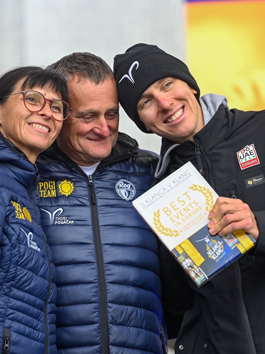 Chaudement vêtu des couleurs de sa veste UAE Team Emirates, Pogačar était radieux, tenant fièrement son prix à la main, partageant un moment d’émotion avec ses parents. Les sourires, les accolades et la joie pure capturés sur le moment en disaient long : ce n’était pas seulement un triomphe professionnel, mais un triomphe profondément personnel. Aux côtés de ses parents, tout aussi fiers, Pogačar incarnait l’humilité et la gratitude, témoignant de l’importance du soutien familial et local dans son parcours, d’un petit village slovène au sommet du cyclisme mondial.