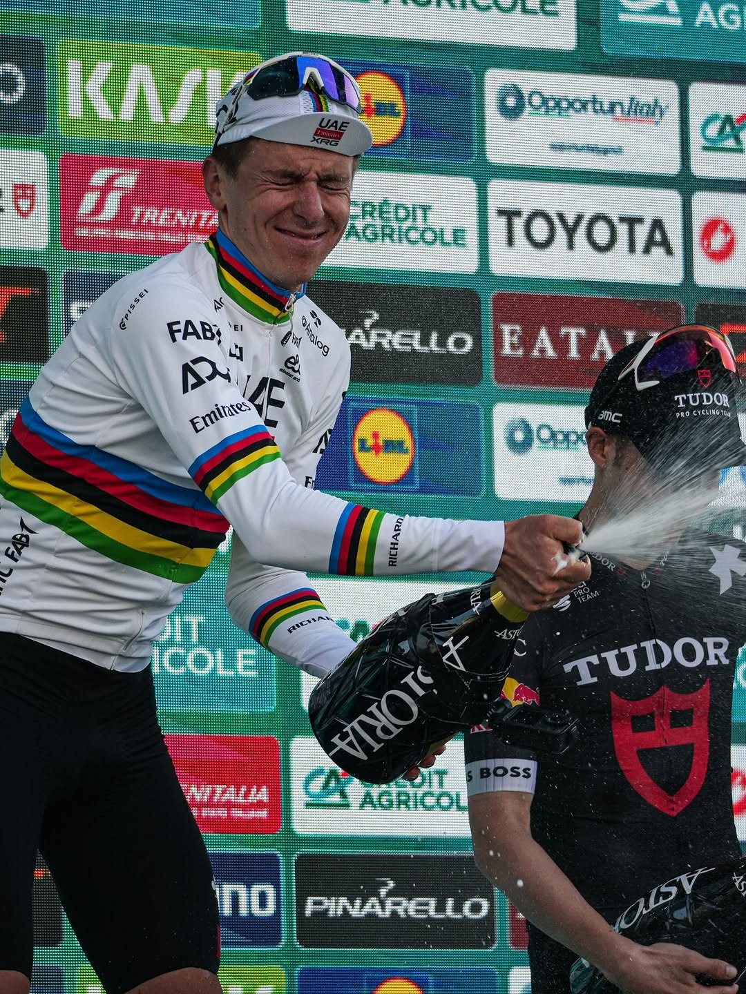 Vêtu de son emblématique maillot arc-en-ciel, le champion du monde des Émirats arabes unis a saisi une bouteille d’Astoria pétillant et a déclenché une explosion de mousse qui a giclé sur la scène. Les yeux fermés, le visage crispé par une douleur moqueuse, il a accidentellement transformé la pluie de champagne en une véritable tempête, se trempant lui-même et un autre coureur de l’équipe Tudor qui a tenté en vain d’esquiver le jet.