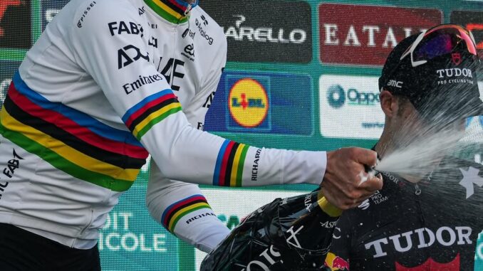 ÉCLABOUSSURES, PÉTILLANTES ET ÉCLABOUSSURES DE VICTOIRE ! Dans un moment hilarant sur le podium, le nouveau champion du monde fait éclater son champagne à pleines dents – les yeux fermés, les rayures arc-en-ciel scintillantes et une joie communicative ! La célébration tourne au chaos tandis que les coureurs rivaux se laissent submerger par les bulles, immortalisant la scène de victoire la plus divertissante de la saison ! ♂️