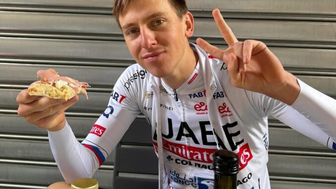 Du Champion au Mode Détente ! ♂️ Après d’innombrables ascensions et des victoires époustouflantes, la superstar de l’équipe UAE Team Emirates, Tadej Pogačar, s’accorde une rare pause : un petit moment de bonheur simple avec un sandwich, un sourire et un signe de la paix. Le roi du cyclisme prouve que même les légendes ont besoin d’un moment pour savourer les petits plaisirs de la vie !