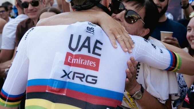 « L’étreinte émouvante d’un champion : quelques instants après une victoire monumentale, le coureur vedette de l’équipe des Émirats arabes unis partage des étreintes remplies d’émotion avec ses proches et ses supporters, créant une scène inoubliable de joie, de soulagement et d’unité, tandis que les fans immortalisent cette puissante célébration qui reflète le cœur, la passion et le côté humain d’une véritable icône du cyclisme. »