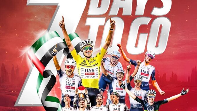 Compte à rebours vers la gloire ! ♂️ Plus qu’une semaine avant que le festival cycliste Emirates-XRG des Émirats arabes unis n’illumine Abou Dhabi. Roulez aux côtés de l’équipe numéro 1 mondiale, profitez des festivités du village des supporters et admirez les futurs champions pédaler à l’ADNOC-Powered Kids Academy ! Ne manquez pas la grande finale d’une saison cycliste 2025 record !