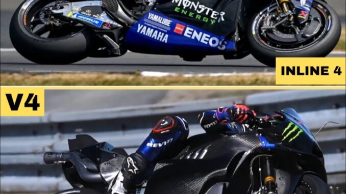 Yamaha teste une nouvelle M1 équipée d’un moteur V4, récemment aperçue à Brno par les pilotes d’essai Dovizioso et Fernandez. Si elle partage toujours les caractéristiques aérodynamiques de l’actuelle M1 à quatre cylindres en ligne, elle bénéficie de modifications telles que davantage de ouïes d’aération et une configuration différente de la sortie d’échappement, l’une des deux sorties étant située sur le côté droit.