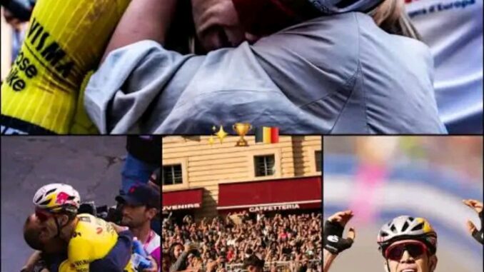 Van tranen tot triomf, de gele trui vertelt een verhaal dat groter is dan de overwinning. In één omhelzing botsen pijn, opoffering en liefde; in de volgende staat een kampioen op voor een juichende menigte. Deze afbeelding vangt de rauwe ziel van de wielersport: hartzeer doorstaan, geloof beloond, en een seizoenbepalend moment dat renners tot legendes maakt en fans tot getuigen van de geschiedenis, wereldwijd, onvergetelijk, voor altijd, onsterfelijk…