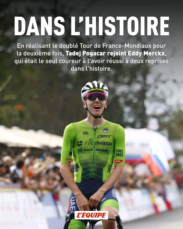 La course fut un véritable spectacle. Pogačar, déjà admiré pour ses attaques lointaines audacieuses, a réalisé une nouvelle performance mémorable, s’échappant à plus de 80 kilomètres de l’arrivée et gravissant les ascensions avec une puissance inébranlable. Alors que ses rivaux tentaient de réduire l’écart, aucun ne parvenait à égaler sa vitesse, son endurance ou son talent tactique. Lorsqu’il a franchi la ligne d’arrivée, les bras levés et enveloppé de la fierté slovène, ce n’était pas seulement une victoire, c’était une déclaration. Ce qui rend cet exploit si remarquable, c’est sa rareté. Seule une poignée de coureurs ont réussi à conserver le maillot de champion du monde, et encore moins l’ont fait avec la même domination et le même brio que Pogačar. La légende du cyclisme Eddy Merckx, souvent considérée comme le plus grand de tous les temps, a réalisé le doublé au début des années 1970. Aujourd’hui, plus d’un demi-siècle plus tard, le nom de Pogačar figure aux côtés de celui de l’icône belge dans les records les plus prestigieux du sport.