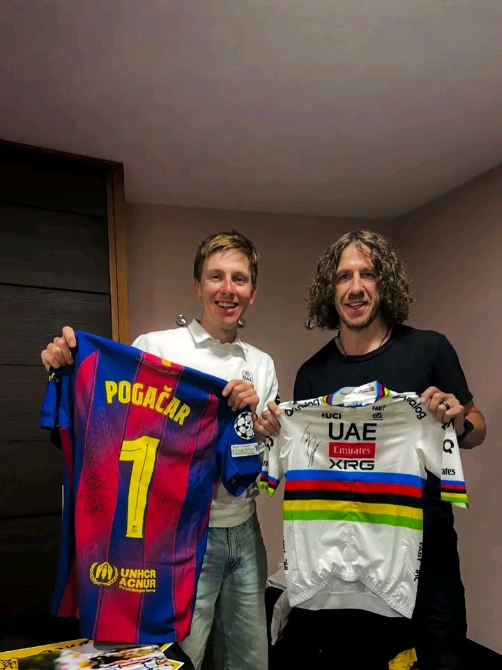 Pogačar, tout juste sorti d’une saison remarquable avec l’équipe UAE Team Emirates, a fièrement remis son maillot de champion du monde cycliste dédicacé à la légende du football, un geste symbolisant l’endurance, la passion et l’excellence sur la scène internationale. En retour, il a reçu un maillot du FC Barcelone dédicacé à son nom et au numéro 1, soulignant la reconnaissance qu’il a acquise non seulement dans le cyclisme, mais aussi dans le monde du sport au sens large.