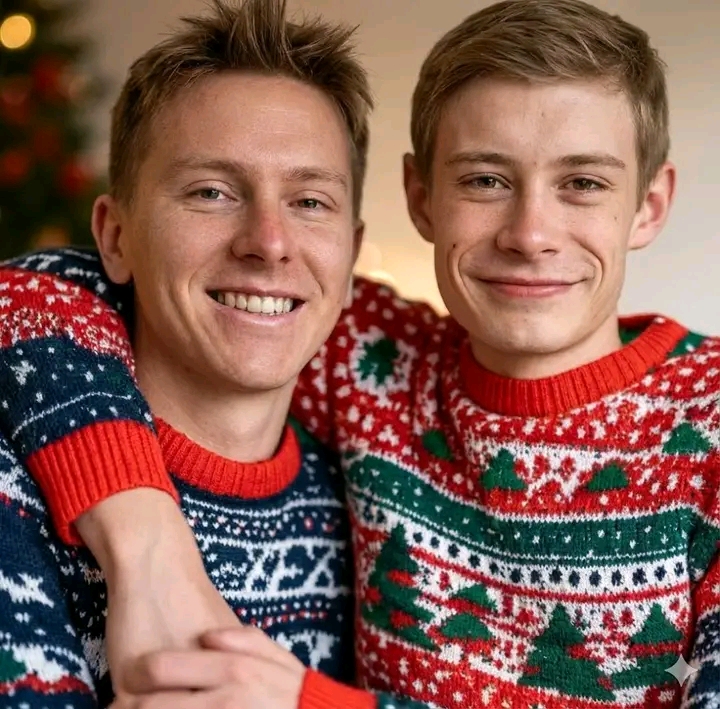 Vêtus de pulls classiques rouges, verts et à motifs hivernaux, les deux jeunes gens sourient naturellement à l’objectif, leurs expressions détendues reflétant confort, confiance et un bonheur authentique. L’un d’eux pose un bras autour de l’épaule de l’autre, un geste subtil mais éloquent. C’est un instant figé dans le temps – calme, intime et profondément humain – et pourtant suffisamment puissant pour toucher des milliers de personnes.