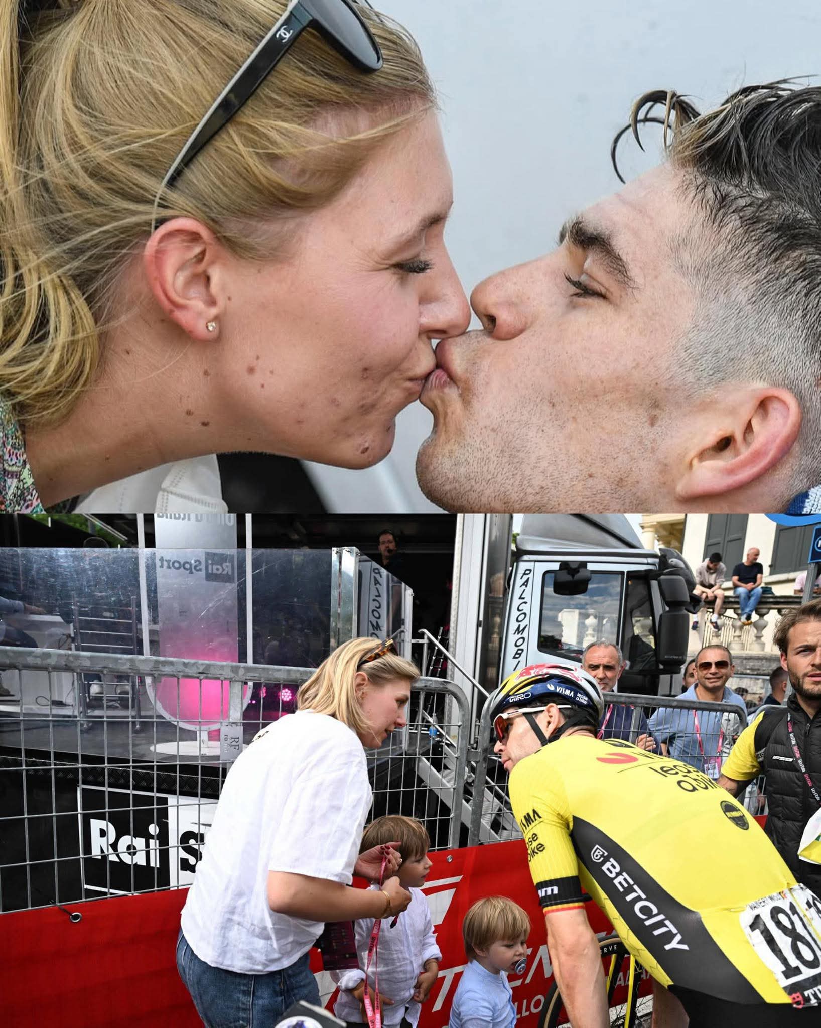 De eerste foto toont de renner die zijn partner in een tedere kus kust. Het zweet glinstert nog op zijn gezicht, zijn haar is door de war van de inspanning van de race. Ze leunt naar voren met een stralende glimlach, haar zonnebril rust op haar hoofd en haar ogen gevuld met onmiskenbare trots. Het is het soort kus dat veel meer zegt dan woorden kunnen: opluchting, liefde, bewondering en een gedeeld begrip van de offers die achter elke pedaalslag zitten.