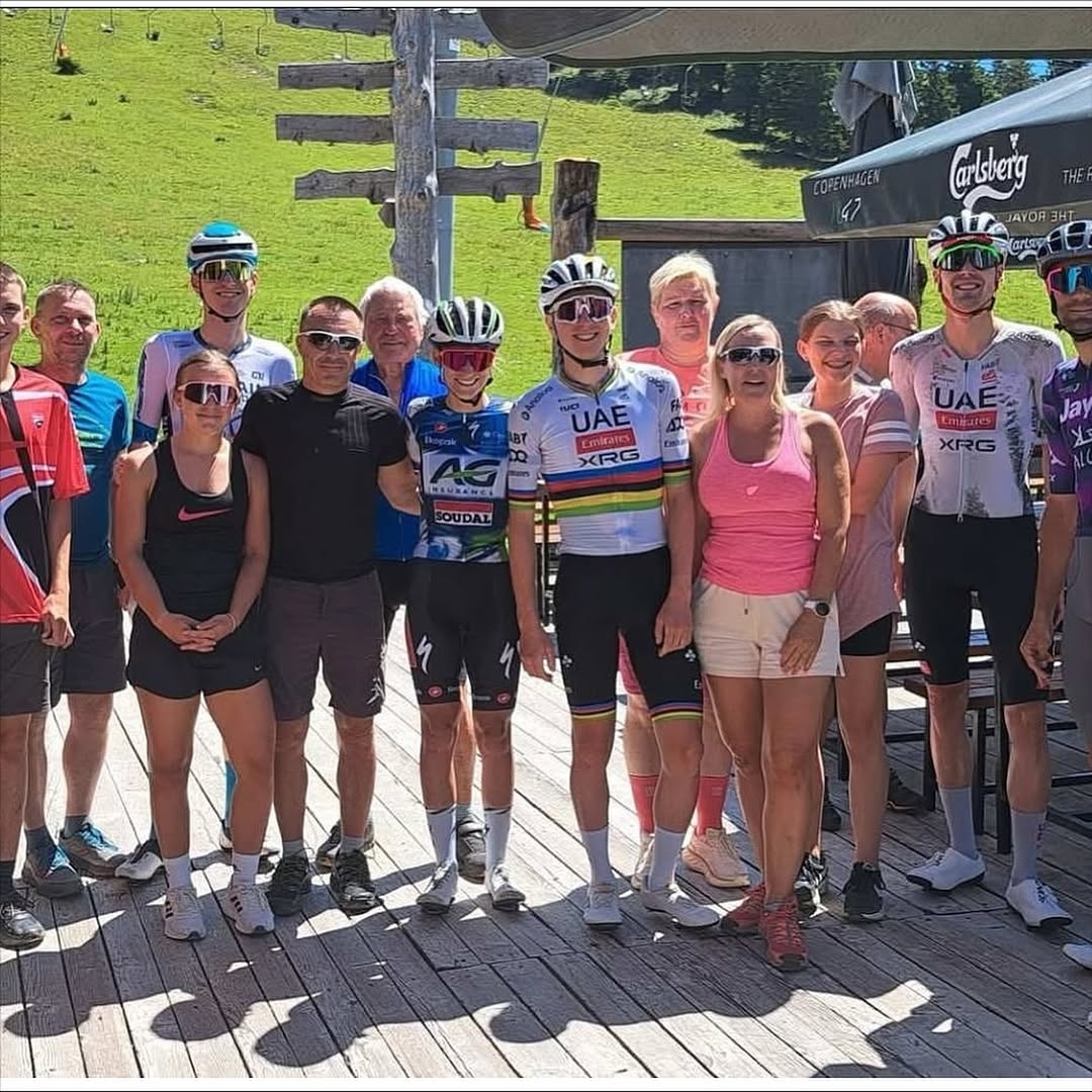 Sur la terrasse en bois d’un charmant café alpin, ombragée de parasols Carlsberg et entourée de collines verdoyantes, des coureurs de différentes équipes – dont des stars de l’UAE Team Emirates et d’AG2R Citroën – se sont retrouvés pour un moment qui semblait suspendu dans le temps. Parmi eux, le maillot arc-en-ciel du champion du monde, flanqué de coéquipiers en blanc et rouge, leurs visages illuminés par le rire plutôt que par la détermination.