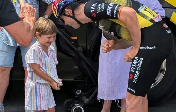 “Hartverwarmend moment tijdens de Tour: een jonge fan straalt van pure vreugde als een profwielrenner een speels gesprek voert onder de zomerzon – een prachtige uitwisseling die toeschouwers doet stilstaan, de wereld herinnert aan de menselijke kant van de sport en de magie, onschuld en emotie vastlegt die geen enkele finishlijn kan meten.”