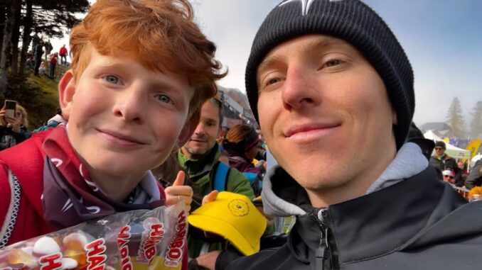 Tadej Pogačar partage un moment touchant avec un jeune supporter lors d’une étape de montagne palpitante : sourires, bonbons Haribo et pure passion pour le vélo ! La superstar slovène prouve une fois de plus qu’il n’est pas seulement un champion cycliste, mais aussi un grand fan des supporters du monde entier.