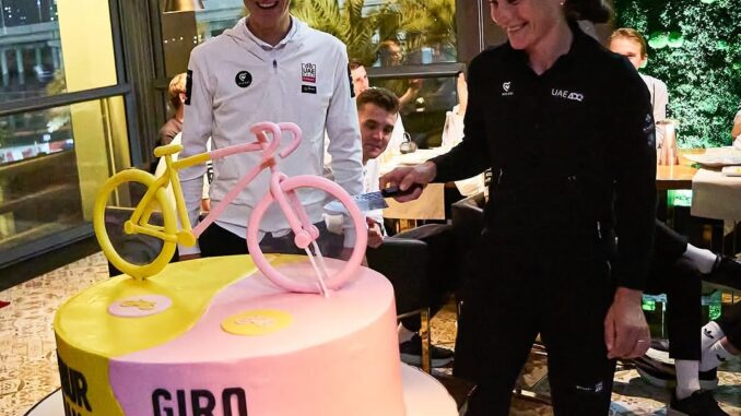 CÉLÉBRATION DE L’HONNEUR DU CYCLISME ! Tadej Pogačar et Urška Žigart partagent un tendre moment en coupant un gâteau sur le thème du Tour de France et du Giro d’Italia après une saison incroyable de triomphes et d’amour. Ce chef-d’œuvre rose et jaune symbolique capture parfaitement leur lien cycliste : champions sur route, partenaires dans la vie, unis par la passion et la victoire.