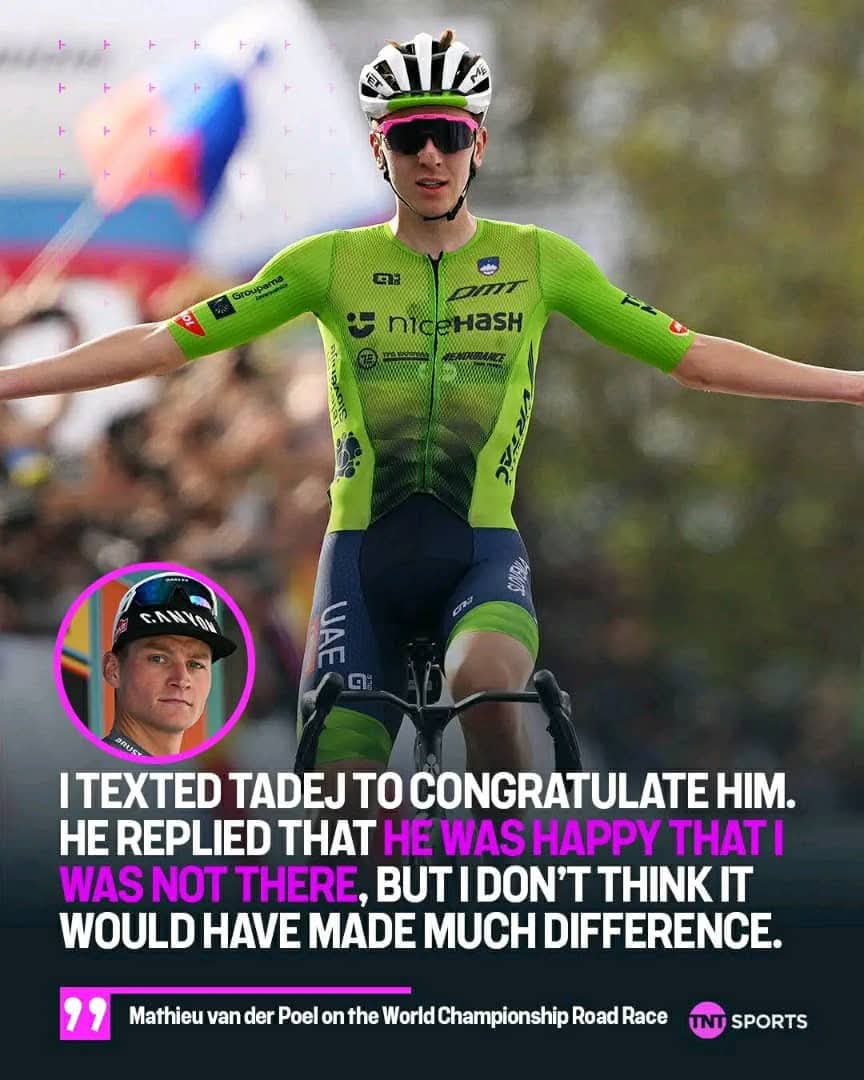 C’était le genre de moment inédit que les fans de cyclisme apprécient particulièrement : deux des plus grands guerriers modernes du cyclisme, Tadej Pogačar et Mathieu van der Poel, échangeaient discrètement et en toute intimité après une nouvelle course exténuante. Les caméras ont capté cette rencontre brève mais poignante, et en quelques minutes, les réseaux sociaux se sont enflammés de spéculations sur ce que les deux légendes auraient pu dire.
