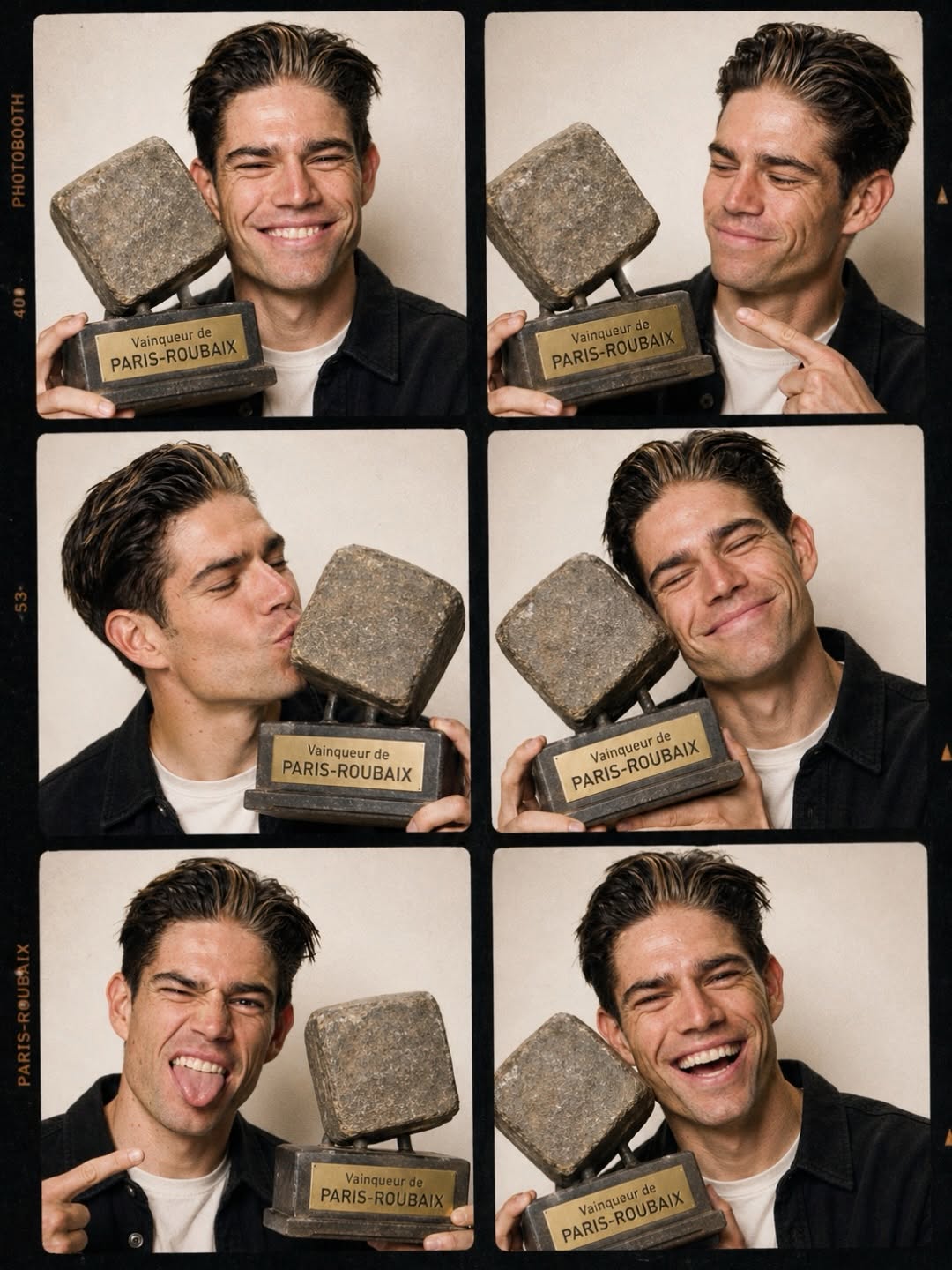 “Steen, zweet en glorie: de triomf in Parijs-Roubaix vastgelegd in één iconisch beeld, waarin een zegevierende kampioen de brute schoonheid van de zwaarste wielerwedstrijd omarmt – van lachen tot tranen, van kussen tot pure vreugde, dit moment vertelt het verhaal van doorzettingsvermogen, opoffering en een onvergetelijke overwinning op de legendarische kasseienwegen.”