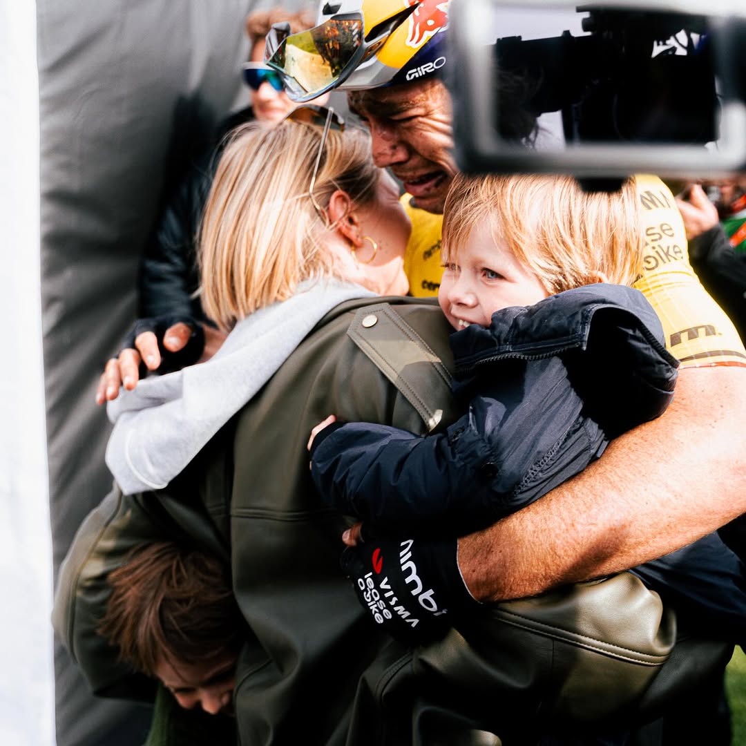 Nog steeds met zijn helm en wielerkleding aan, kon de renner zijn emoties nauwelijks bedwingen toen hij zijn partner en jonge kind omhelsde. Zijn gezicht, getekend door vermoeidheid en inspanning, vertelde het verhaal van een slopende race die hem tot het uiterste had gedreven. Maar in die omhelzing maakte de pijn van de race plaats voor opluchting, vreugde en trots.