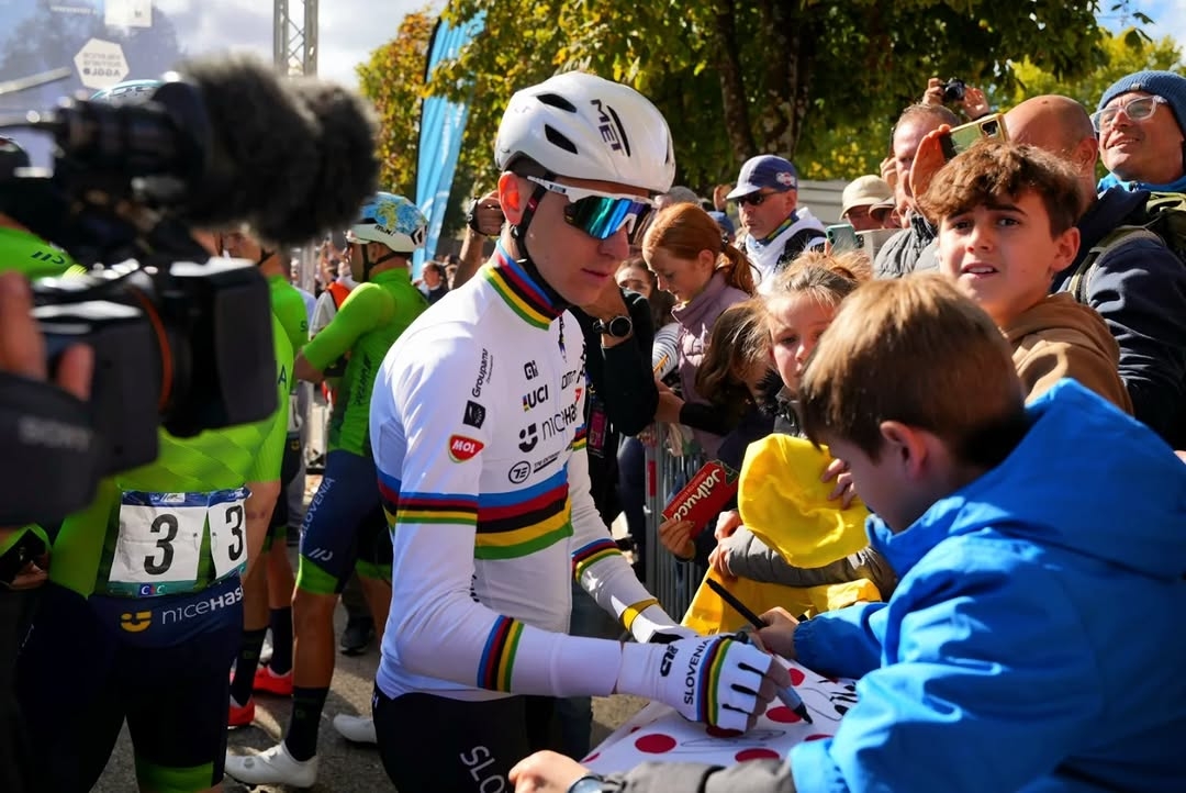 L’événement, organisé sous un ciel d’automne éclatant, a vu des fans de tous âges se rassembler le long des barrières pour apercevoir leur héros cycliste. Des enfants brandissaient des posters, des maillots et des carnets, les yeux écarquillés d’excitation à l’approche du champion. Malgré le calendrier chargé de la course et l’attention médiatique constante, il s’est arrêté, a souri chaleureusement et a commencé à signer des autographes. Les flashs des appareils photo ont brillé tandis qu’il se penchait pour saluer les jeunes fans, dont beaucoup vivaient un moment inoubliable.