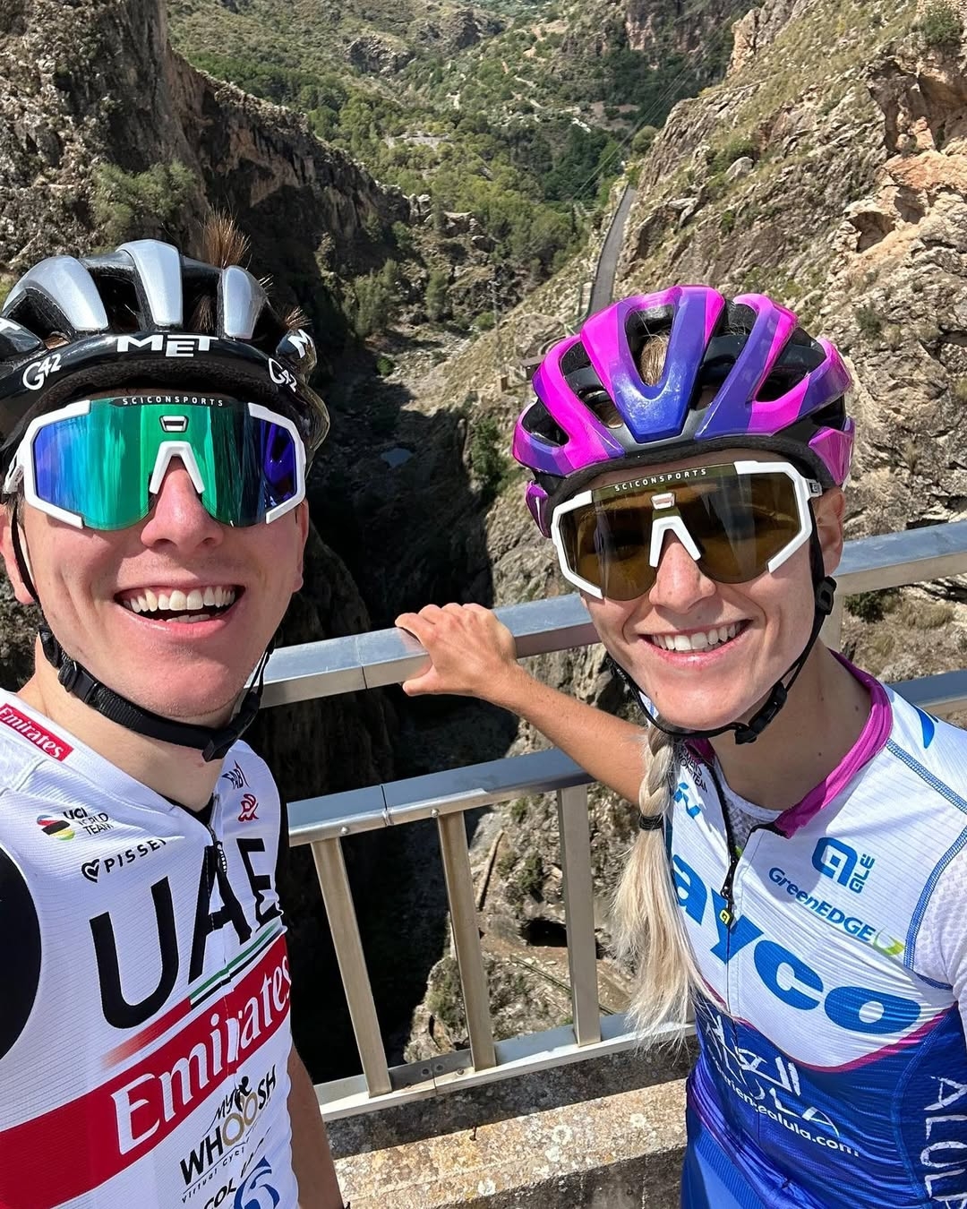 Vêtus des tenues de leurs équipes respectives – UAE Team Emirates pour lui et Team Jayco AlUla pour elle – les deux amoureux ont pris un selfie radieux sur un pont surplombant une gorge spectaculaire. Derrière eux s’étendait une route sinueuse qui semblait se fondre dans les falaises rocheuses, entourée d’une végétation luxuriante et des teintes dorées du paysage accidenté. Leurs sourires en disaient long : amour, bonheur et liberté sur deux roues.