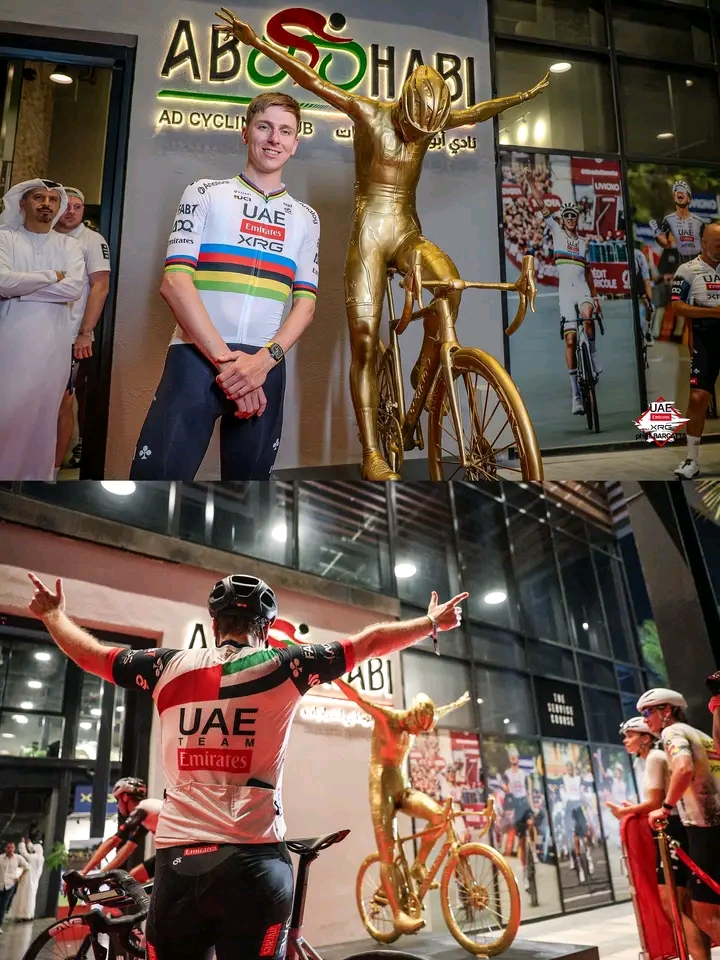 Un moment époustouflant à Abou Dhabi : les fans de cyclisme se rassemblent autour d’une magnifique statue dorée immortalisant le triomphe d’un champion, tandis que les coureurs de l’équipe UAE Team Emirates célèbrent sous leurs yeux la légende qui s’écrit sous leurs yeux. Fierté, passion et histoire se mêlent dans une scène inoubliable : le monde du cyclisme assiste à un hommage qui capture l’esprit, la domination et la légende grandissante de l’étoile la plus brillante de ce sport.
