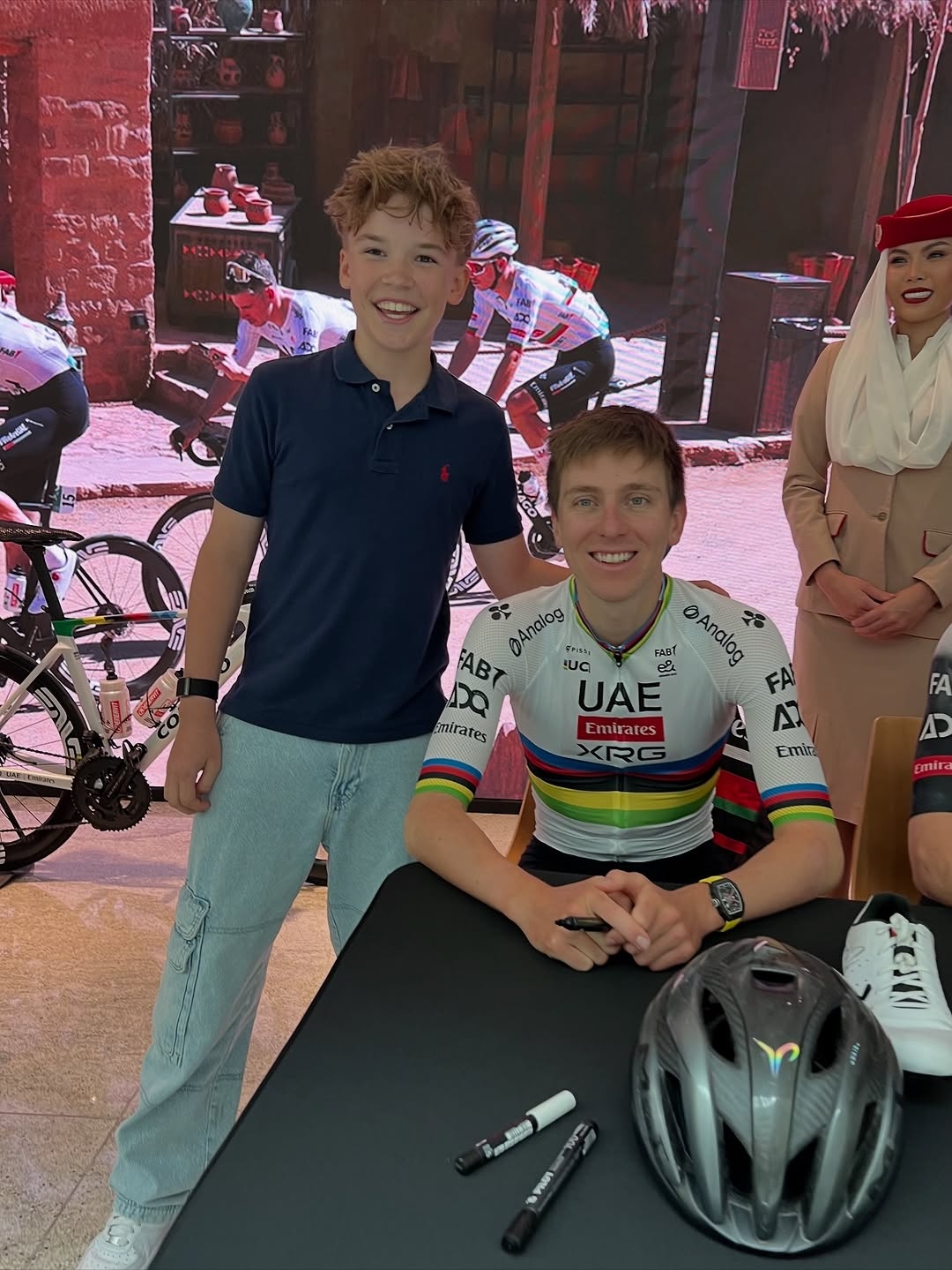 Le jeune fan, rayonnant d’enthousiasme, s’est approché du champion du monde avec une admiration profonde. Vêtu d’un polo bleu marine et d’un jean, il ne pouvait cacher sa joie en posant pour une photo aux côtés du champion souriant, qui portait le maillot arc-en-ciel de l’équipe ÉMIRATS ARABES UNIS, symbole d’excellence et de travail acharné. L’image, illustrant les deux sourires, a déjà commencé à circuler en ligne, faisant fondre les cœurs des supporters du monde entier.